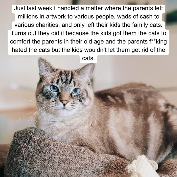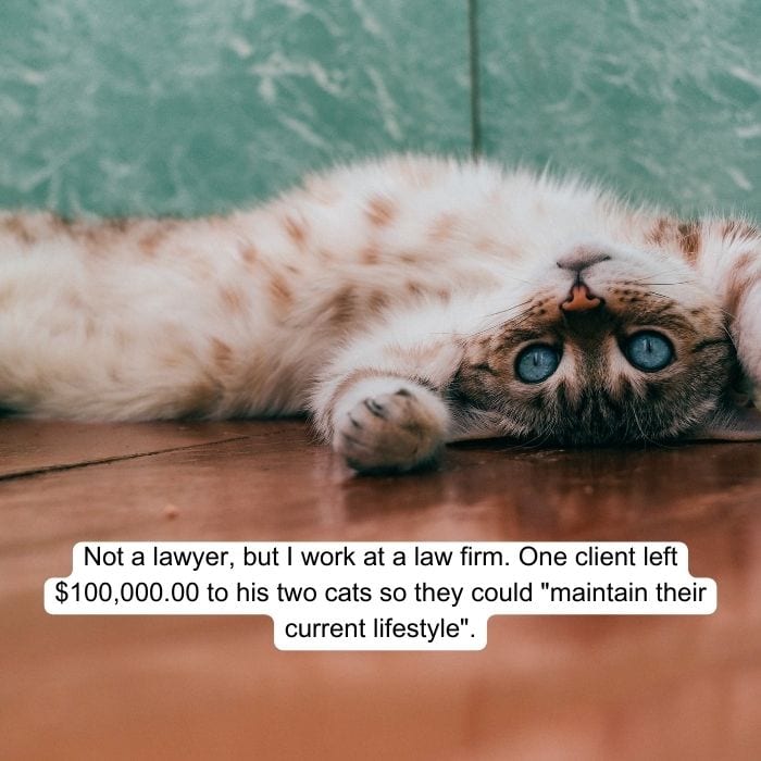 On a Reddit thread talking about hilarious requests lawyers have had clients ask to put in their wills, this one stands out. A woman left her house and estate to family friends, but only for as long as her cats remained alive. Upon the passing of her beloved pets, the woman’s house was supposed to be sold, and her estate donated. Of course, the family friend found an easy loophole for this and simply brought in more cats when one passed. We wonder how long they were able to get away with this!