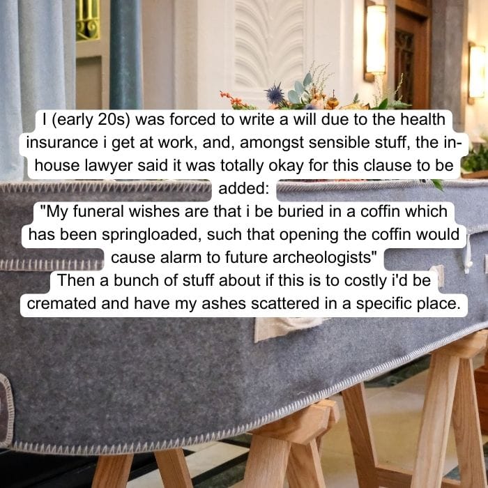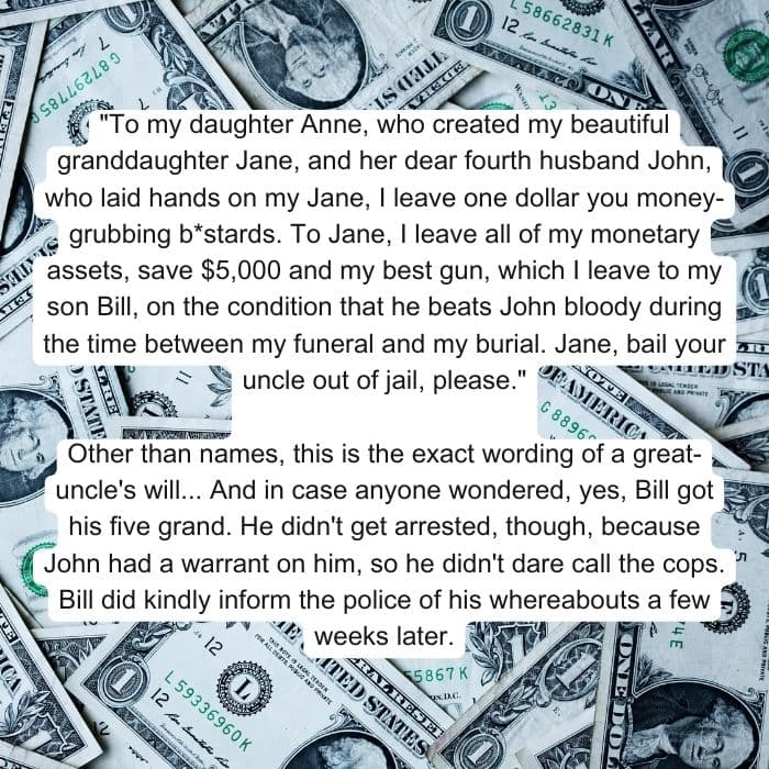 When most people sit down to write their will, they have a plan in mind. That plan usually involves dividing up their assets among loved ones and friends or donating part of their wealth to charities. However, some people feel they didn’t get the justice they were owed in life and are determined to seek it out in death. Others are simply petty and want to let the people they disliked in life know exactly what they thought about them. People are sharing the hilarious and wild things others have put in their wills, and we’re here for it! Get ready to enjoy the tea and cackle at the stories we have lined up for you.